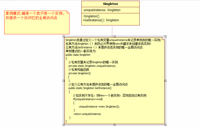 说到单例模式,大家第一反应应该就是——什么是单例模式?,从“单例”字面意思上理解为——一个类只有一个实例,所以单例模式也就是保证一个类只有一个实例的一种实现方法罢了(设计模式其实就是帮助我们解决实际开发过程中的方法, 该方法是为了降低对象之间的耦合度,然而解决方法有很多种,所以前人就总结了一些常用的解决方法为书籍,从而把这本书就称为设计模式),下面给出单例模式的一个官方定义:确保一个类只有一个实例,并提供一个全局访问点。为了帮助大家更好地理解单例模式,大家可以结合下面的类图来进行理解,以及后面也会剖析单例模式的实现思路:
